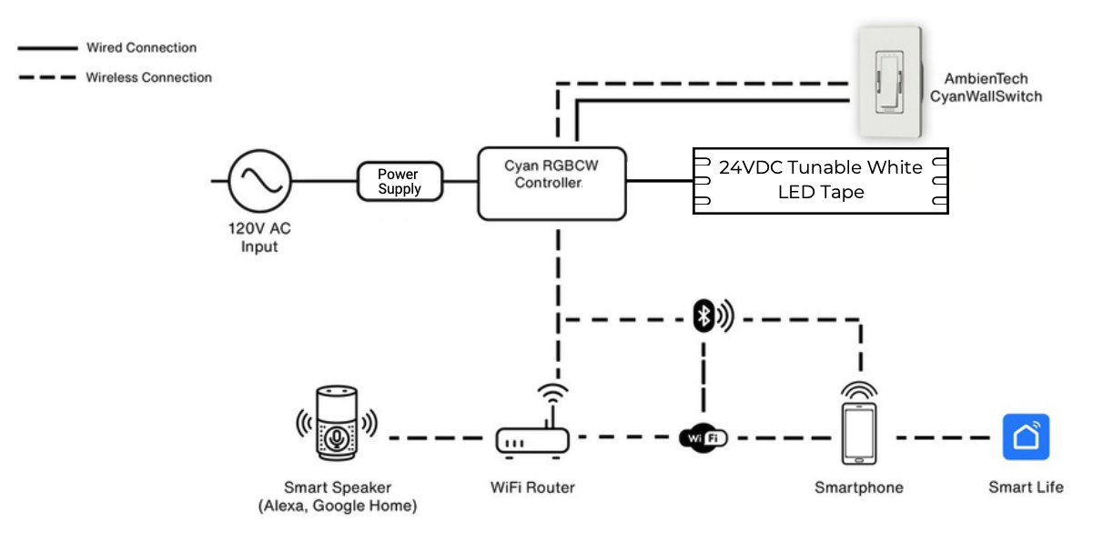 Compatible with the Cyan wall switch to manage multiple controllers. Seamlessly integrates with the Smart Life app for color, dimming, timers, and scene saving. Voice control via Amazon Alexa or Google Home. Quick pairing with Wi-Fi and Bluetooth.